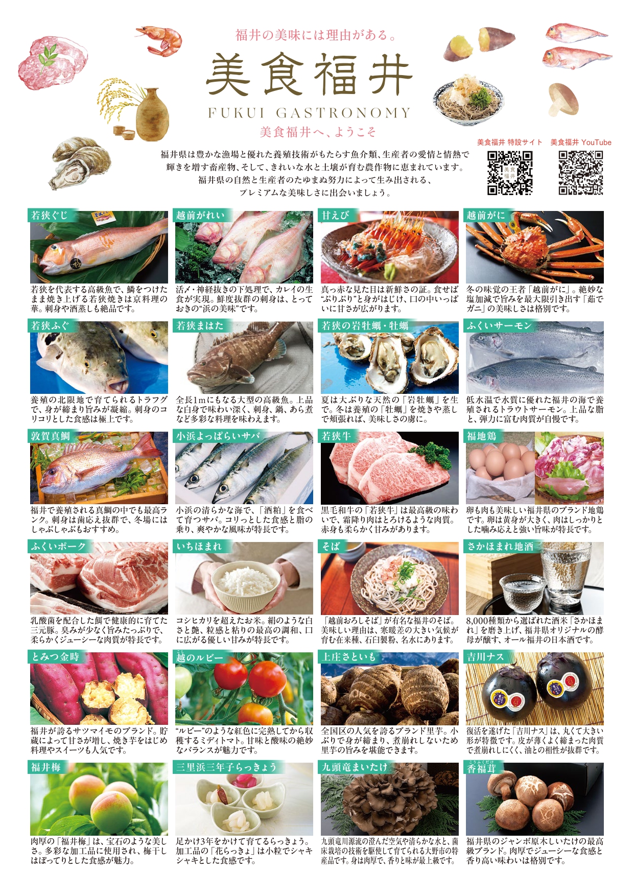 いちほまれ/そば/さかほまれ地酒/とみつ金時/越(こし)のルビー/上庄さといも/吉川ナス/福井梅/三里浜三年子らっきょう/九頭竜まいたけ/香福茸(こうふくだけ)