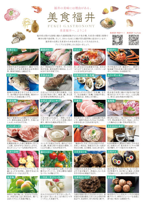 若狭ぐじ/越前がれい/甘えび/越前がに/若狭ふぐ/若狭まはた/若狭の岩牡蠣・牡蠣/ふくいサーモン/敦賀真鯛/小浜よっぱらいサバ