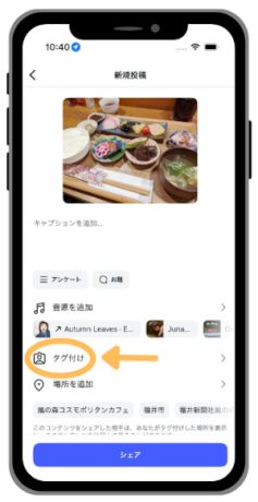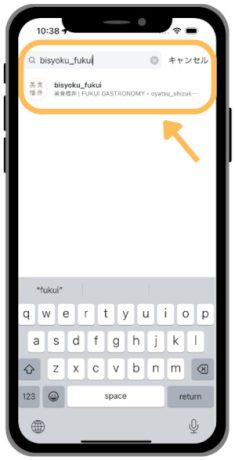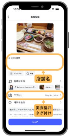 投稿時に「タグ付け」を選択し、検索窓に「bisyoku_fukui」と入力してタグ付けしましょう。
