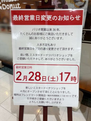 【悲しみ】福井市・パリオのミスドが3/31に閉店するって。36年間ありがとう……