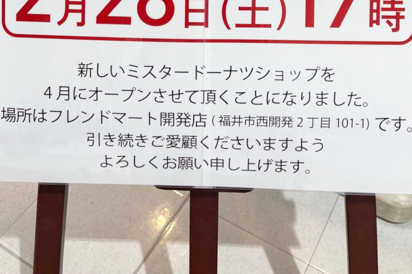 なんと、新たに、福井市西開発の「フレンドマート開発店」内に、4月に「ミスタードーナツ フレンドマート開発店」がオープンするという情報を入手!