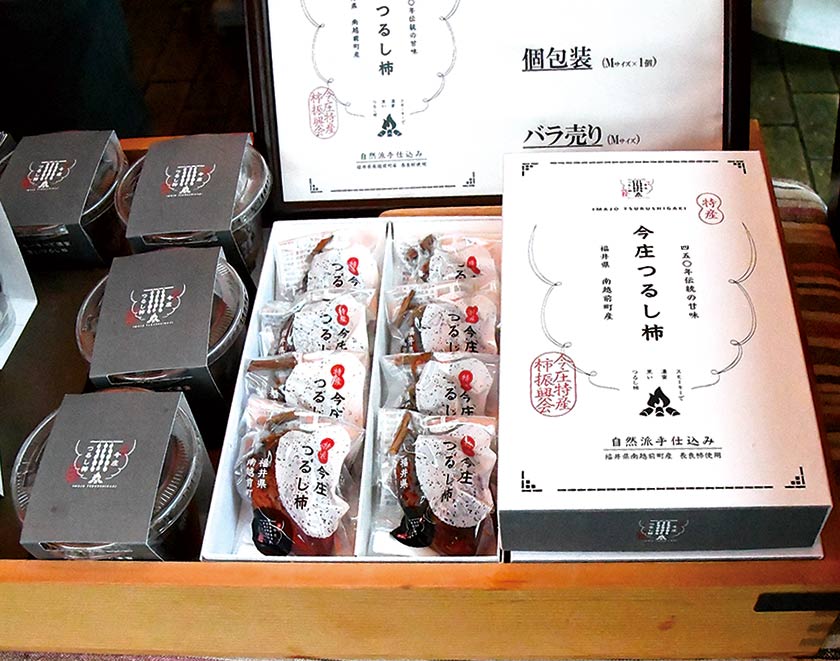 ひとつずつパッケージされたつるし柿は日持ちもする。今庄つるし柿は贈答用としての需要も高い