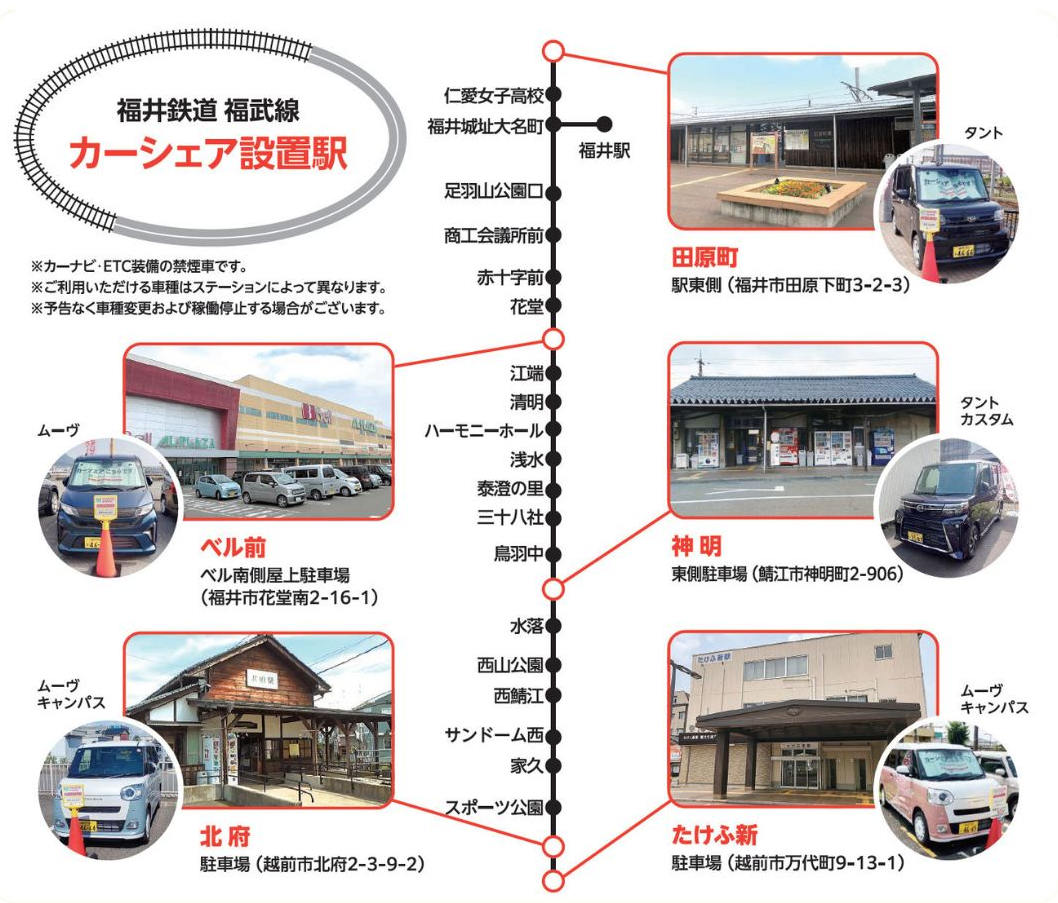 「福井鉄道×ダイハツカーシェア」とは、沿線の駅や駅近隣に設置されたカーシェアスポットで、利用者がダイハツの軽自動車を必要な時に、必要なだけ借りられるサービスです。
