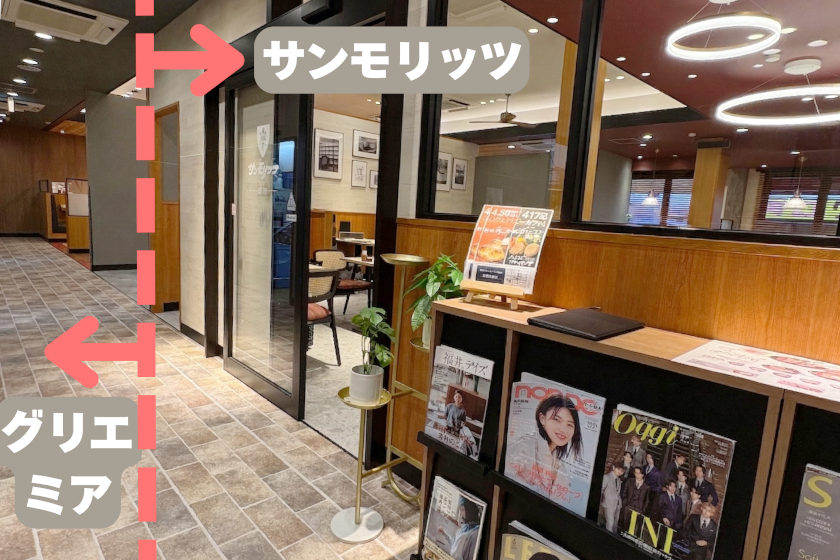 ハンバーグカフェ「グリエ・ミア」と老舗喫茶店「サンモリッツ」の2ブランドが同居する珍しいスタイルのお店。