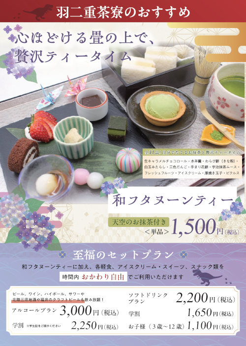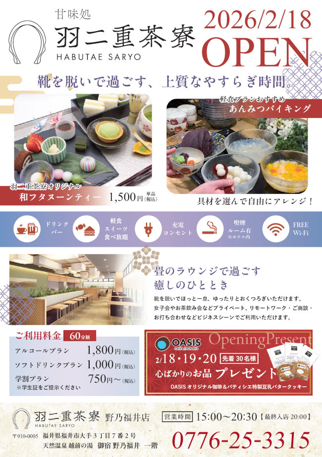 あんみつバイキング付フリードリンクの和カフェが福井駅前に登場! 2/18(水)に「羽二重茶寮 野乃福井店」がオープンするよ。【ふーぽを見たで300円OFF】