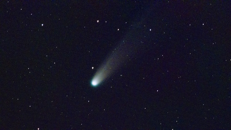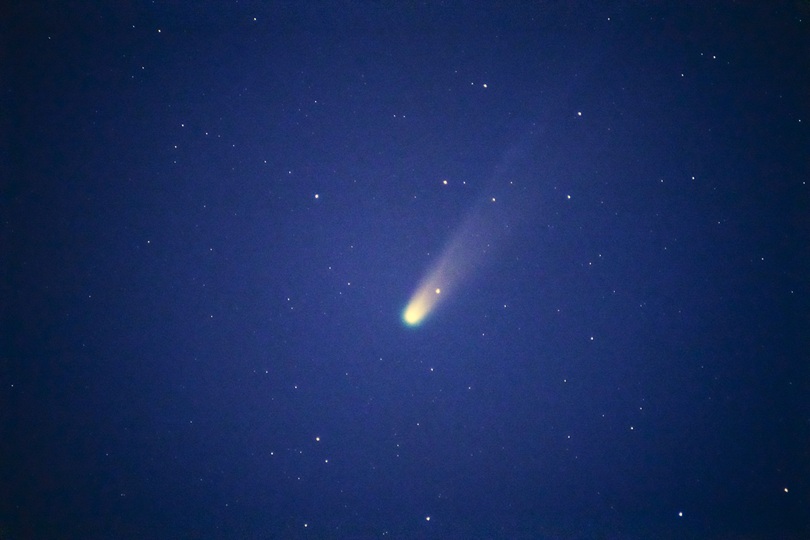 望遠レンズ(600mm)で撮影したレモン彗星。ぼんやりと広がるコマと、そこから長く伸びる尾の様子がよくわかります。