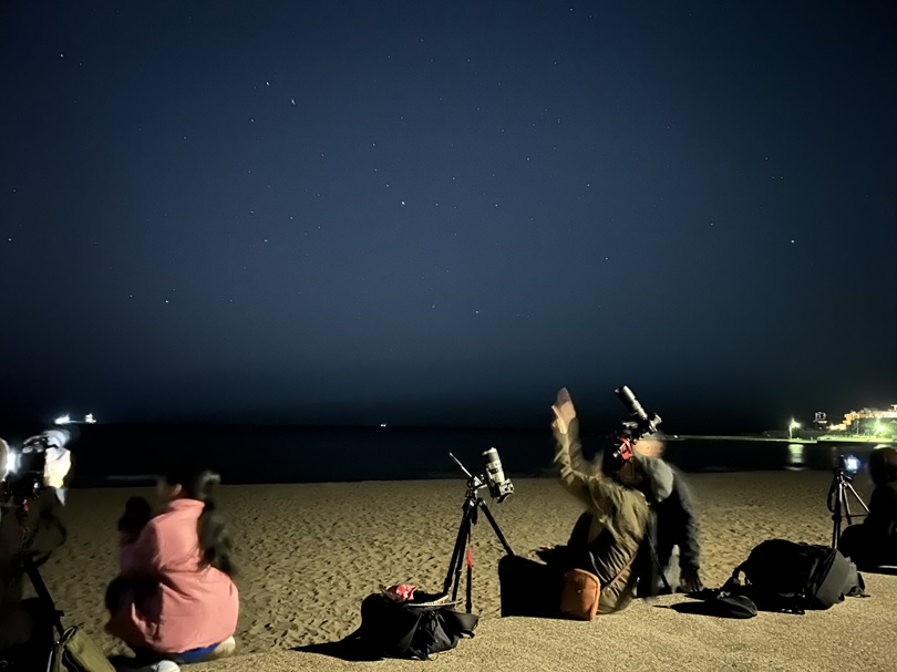 ビーチの前に三脚をずらりと並べ、参加者のみなさんが思い思いにカメラをレモン彗星へ向けてシャッターを切っていきます。