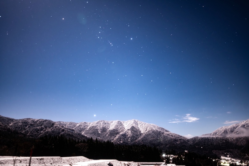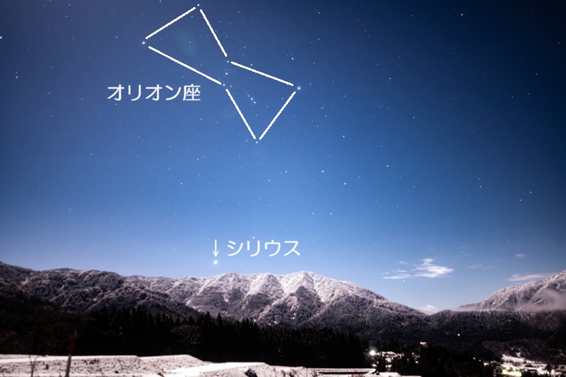 冠雪した山々の上には、おおいぬ座のシリウス、そしてオリオン座。