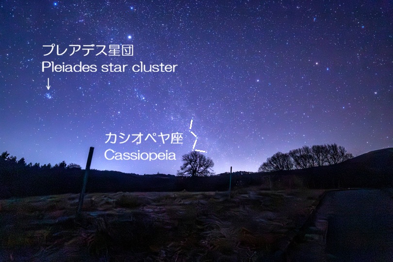 カシオペヤ座と天の川、その隣で優しく輝くプレアデス星団