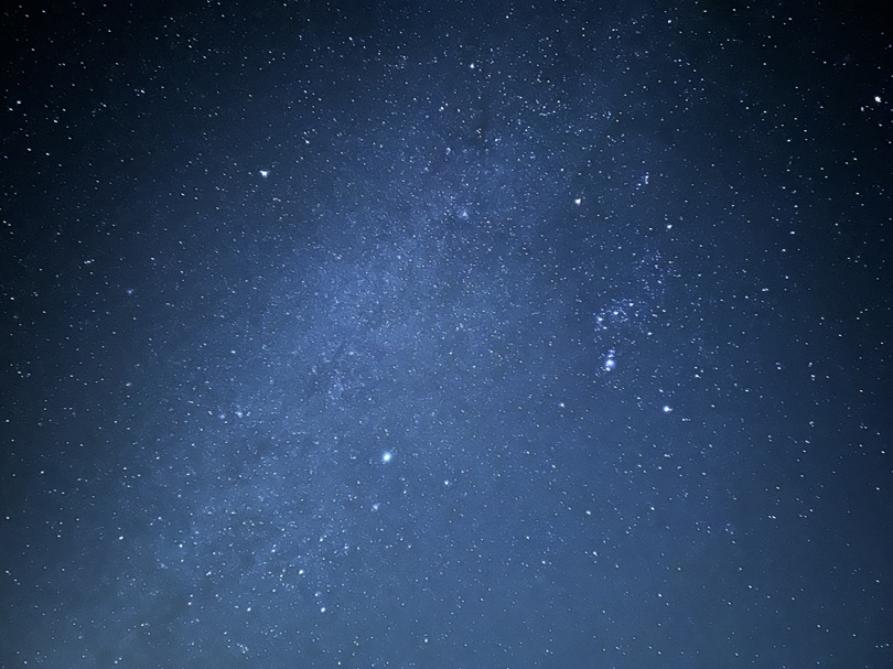 天の川のそばには、若い星たちが集まるプレアデス星団(すばる)も肉眼でも見つけられる、可愛らしい星の集まりです。