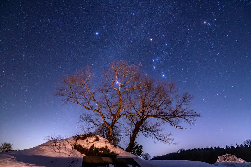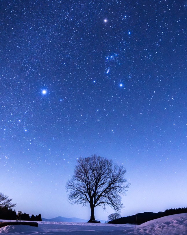 昨年オープンしたキャンプ場の横の道から雪原を見渡すと、ポツンと立つ樹木、その上にオリオン座を見つけることができました。