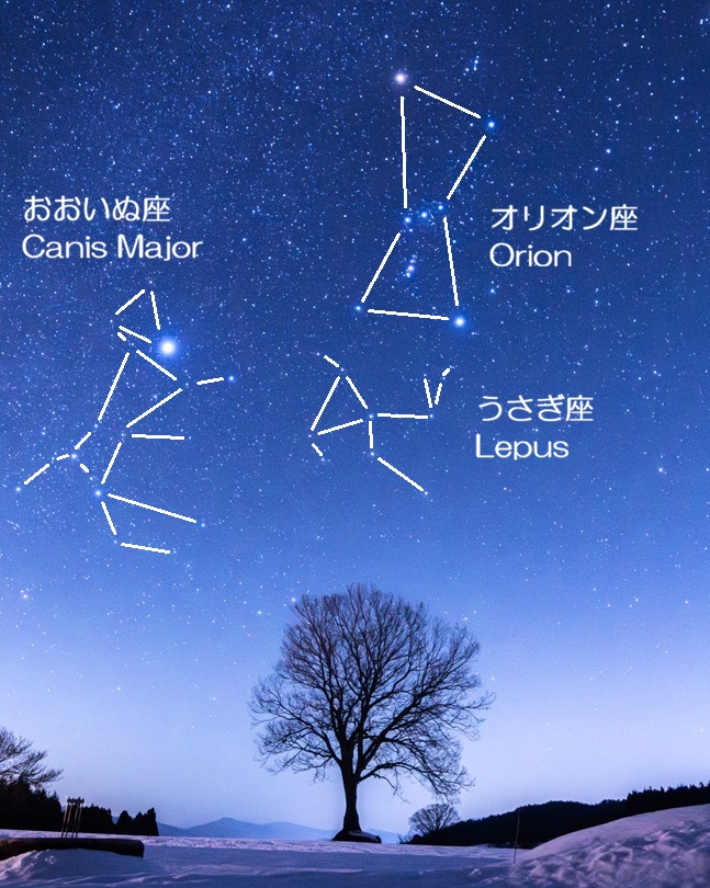 オリオン座と樹木の間をよく見ると、小さな星たちがたくさん輝いて見えて、いつもはあまり意識しない「うさぎ座」を見つけることができました。