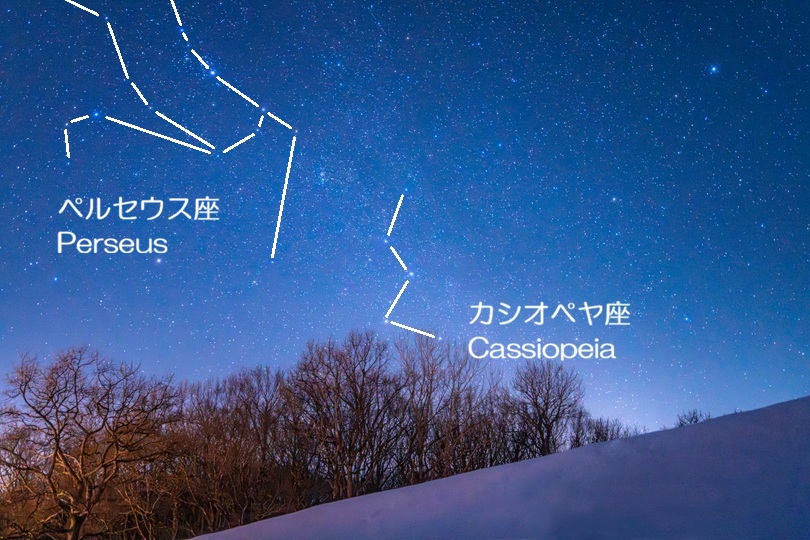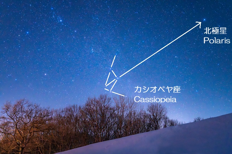 除雪済みの道を歩いていると、林の方向にカシオペヤ座が輝いていることに気づきました。
