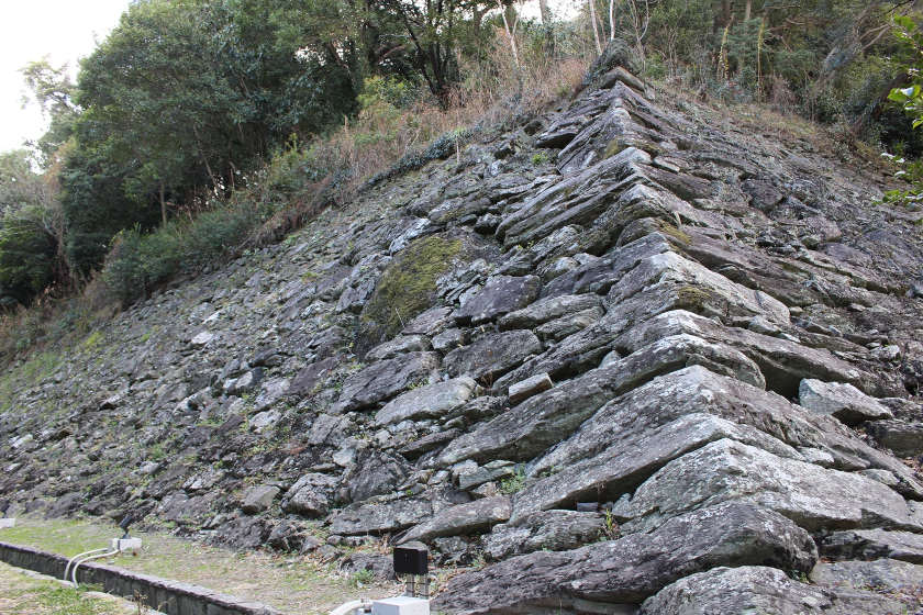 豊臣家が関わった時代に積まれた石垣の特徴は「紀州の青石」と呼ばれる緑色片岩を中心とした自然石をそのまま積み上げる「野面積み」です。