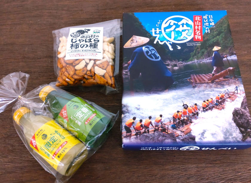訪れた時に購入したお土産たち。じゃばらジュース、じゃばら柿の種、丸太を模した筏せんべい