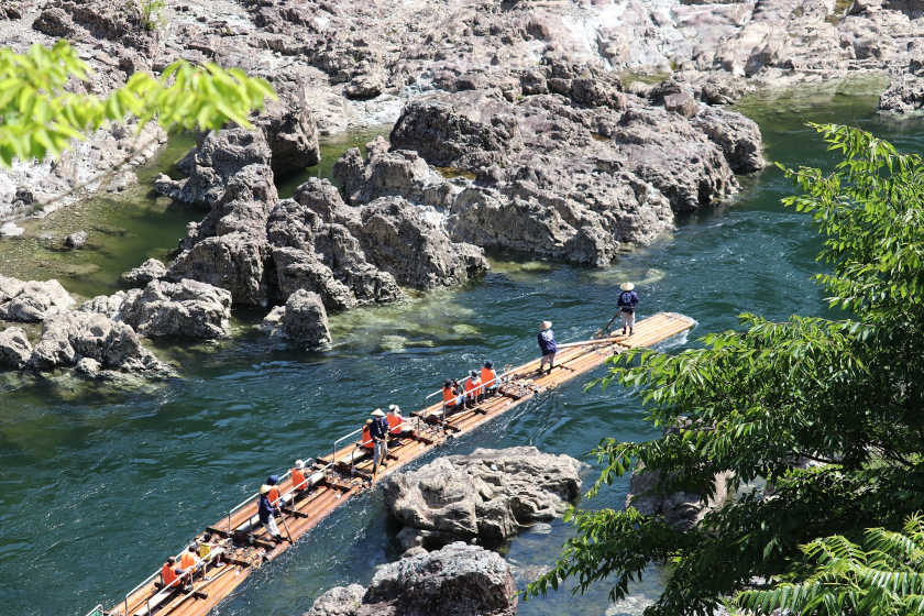 かつて木材運搬に利用された「筏流し」を体験できる観光の目玉で、観光用の丸太の筏に乗って急流を勢いよく下るアクティビティです。