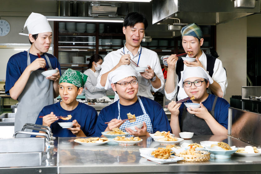 そば部の生徒たちと、メニュー開発をサポートする株式会社たからやの宝山栄一さん