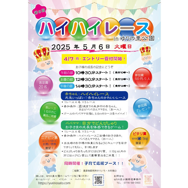 | 対象 | ハイハイでの移動ができる、未歩行の赤ちゃん(レース開催時1歳0ヶ月まで)と、そのご家族様 |