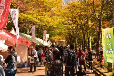 紅葉で色づく会場で、大野産の穴馬かぶらや九頭竜まいたけ、里芋、手打ちおろしそばなどを販売します。 ダム見学や化石発掘体験などもあり。