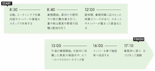 業務では相手の立場に立ち、何が必要か考えて前向きに取り組む姿勢が求められます。問題を一人で抱え込まないようにするフォロー体制のほか、仕事と生活のバランスが取れる勤務体制も充実。自然豊かな環境で伸び伸びと働きながら、農業と福祉の課題に貢献し、社会とつながるやりがいを感じられる場所です。