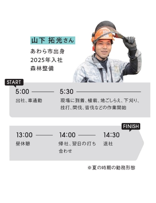 森林整備からドローンでの苗木運搬まで幅広い作業に携わり、山が整っていく様子を実感できることが大きな励みです。これまでにない体験ができ、知識や技術が身に付けられるのもこの仕事ならではです。