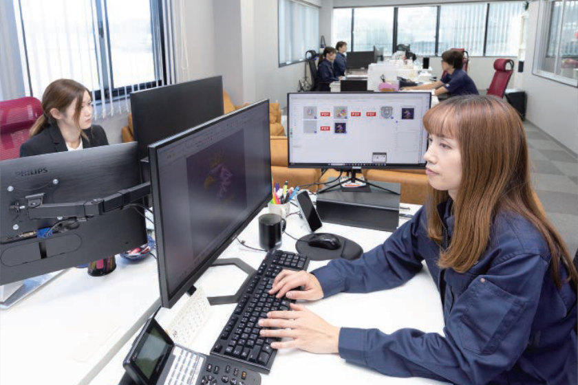明るいオフィスで、刺繍データ作成や事務作業を行っています