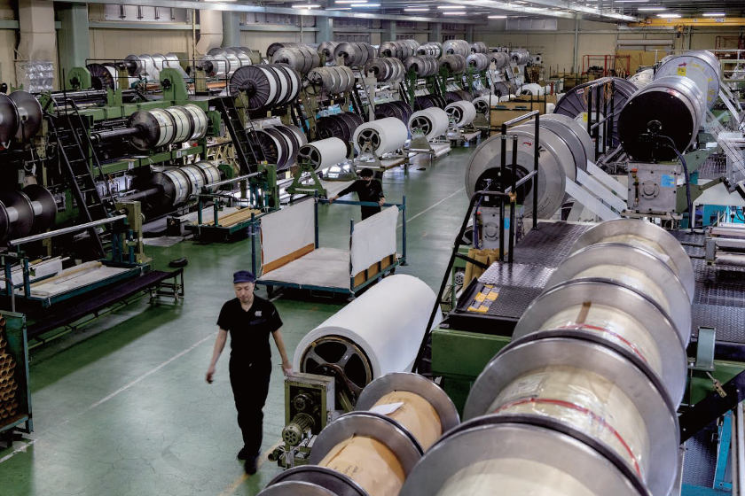 食品や生活雑貨、電化製品と、私たちの身の回りにある物の多くは段ボールを使って運ばれ、ネット通販の普及とともに、需要は高まってきました。この段ボールを日本で初めて製造し、国内シェアナンバーワンを誇るのが当社です。より少ない資源で大きな価値を生み出す〝Lessismore.〞を掲げ、地球環境にやさしいさまざまな段ボールを生産しています。段ボールは表面の紙「ライナ」と、その間にある波型の紙「中しん」からできています。金津工場では、段ボールの原紙であるライナ原紙と中しん原紙を生産しており、原料の97%は古紙等のリサイクルによるものです。