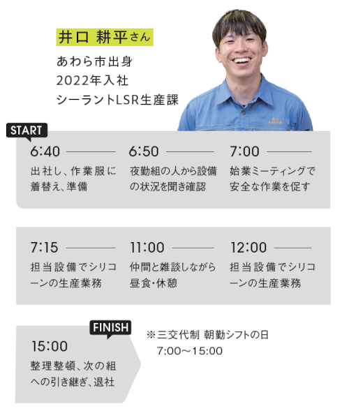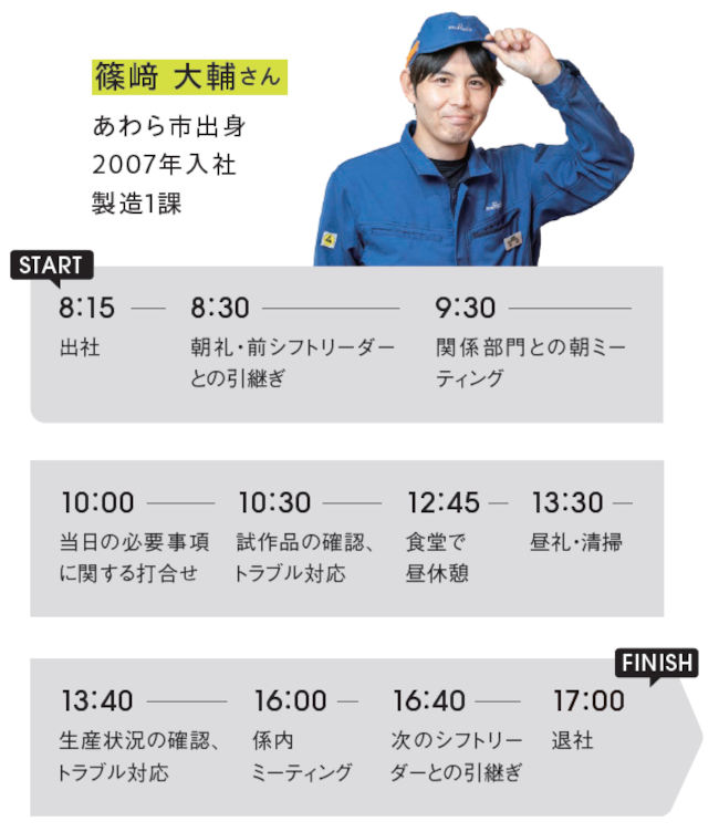 精密な製品を扱うため、勤務時間中は業務に集中し、休憩時間や休日はしっかり休めるような工夫をしています。中でも、有給休暇の取得予定日をスケジュールに登録してもらい、全社員が見られるようにしたことで、年休の計画的取得に結びついています。