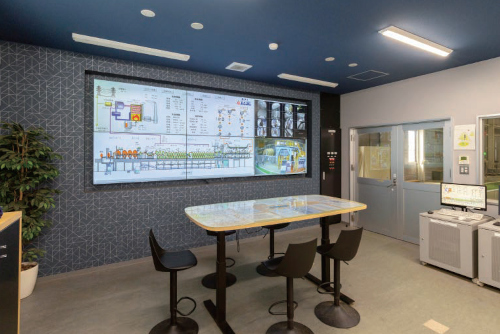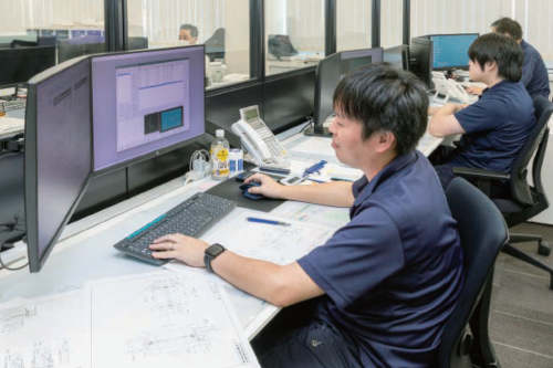 制御室には生産設備の制御や監視を行うモニターが並びます