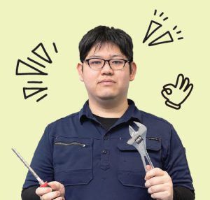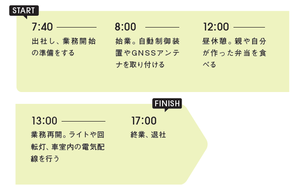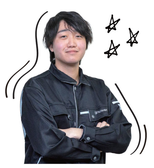 除雪トラックに電装部品の取り付 けや電気配線などを行う電装課に所 属しています。同部署には4人在籍 し、2人は架装、2人は取り付けを 行っています。除雪トラックを出荷 できる状態にする最終工程なので、 毎日気を引き締めて取り組んでいま す。電装系の取り付けが全て完了し、 納品する時に喜びを感じます。先輩 の力を借りず、自分一人でやり遂げ たときは「うまくいった!」とガッツ ポーズ。理想は「難しいことを簡単に 考えられるようになること」。動作 チェックなどでトラブルが起きた際 にも、冷静な原因究明や判断ができ るエンジニアになりたいです。
