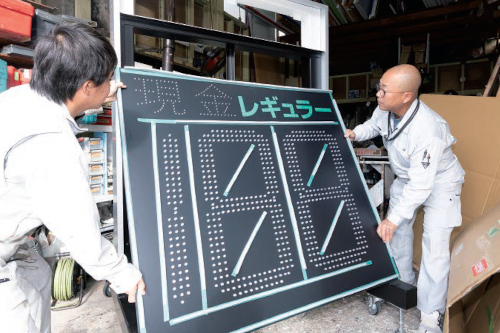 仕事は、パソコン作業、溶接やコンクリ建植、LEDを使用した電飾看板製作などバリエーションに富んでいます。社員は、一人一人が技術向上に努め、資格取得にも積極的なプロフェッショナルです。ゴンドラ操作者や電気工事士、広告美術仕上げ技能士など、資格取得に必要な費用は会社が負担。また、出勤・退勤時間は出産や育児、介護など、社員の生活状況に合わせて柔軟に決めることができ、安心して長く働ける環境を整えています。