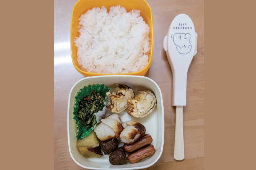 子どものお弁当のついでにささっと。ミートボールやウインナーにちくわとシンプルですが、玉子焼きがネコなのがポイントです(笑)。店奥の休憩スペースでゆっくり過ごしています。