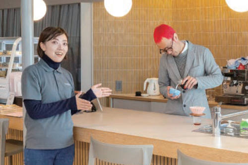 スタッフは接客やレジ、商品陳列、自転車の貸し出しの受付、調理補助などさまざまな業務を担当。地元の女性スタッフが多いこともあり、親しみやすい接客が好評です。吉崎御坊に参拝する人の要望に応え、店内には線香やろうそくも並ぶなど、この土地ならではの特色も出ています。