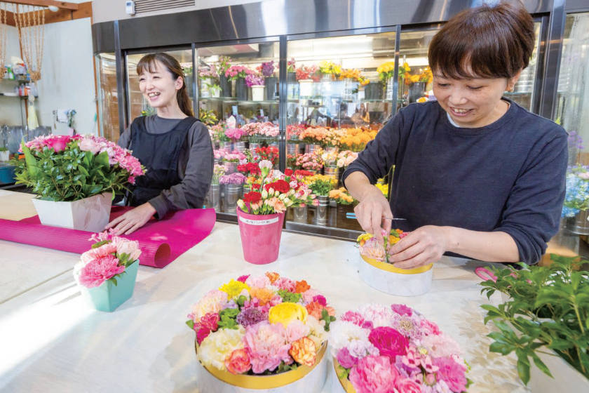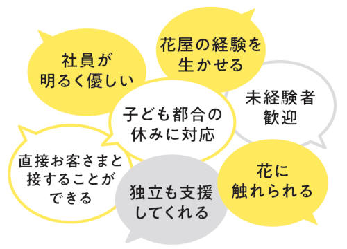 いつも「ありがとう」の心を胸に、一人一人の個性を生かし、信頼・誠実・創意工夫をもって笑顔で働ける会社が目標です。スタッフ同士で声を掛け合い、コミュニケーションを大切に。未経験者でも安心して働けるよう、生花の取り扱いから製作・販売まで基礎から分かりやすく指導し、成長へのサポートに注力しています。有給休暇が1時間単位で取れるので、急用の際に利用でき、時間を有効に使えます。今後は、これまで以上にニーズに応えるべく、常にお客さまの気持ちに寄り添い、心を込めた花をお届けできるよう、技術と知識の成長を続けていきます。