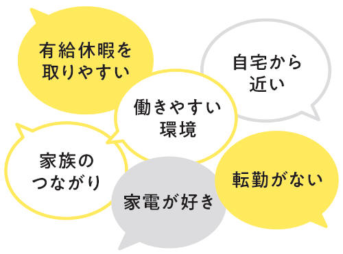 家電製品は進化するサイクルが早く、満足のいく接客を行うには商品知識が欠かせません。そこで製品の説明会・研修会・展示会への参加など、最新情報や知識を得る機会を積極的に設けています。また、ワークライフバランスにも取り組んでおり、休憩時間の過ごし方や有給休暇取得の自由度を高めています。今後は、これまでと変わらず地域のお客さまに寄り添いながら、リフォームなどにも力を入れ、未来の豊かな暮らしをトータルコーディネートできる会社になることが目標です。