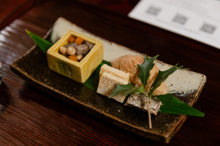 越前がにのいなり寿司、イワシの梅煮、タラの子落雁、なまこの鬼おろし和えなど福井の恵みを感じる八寸