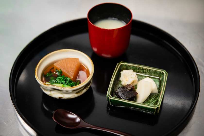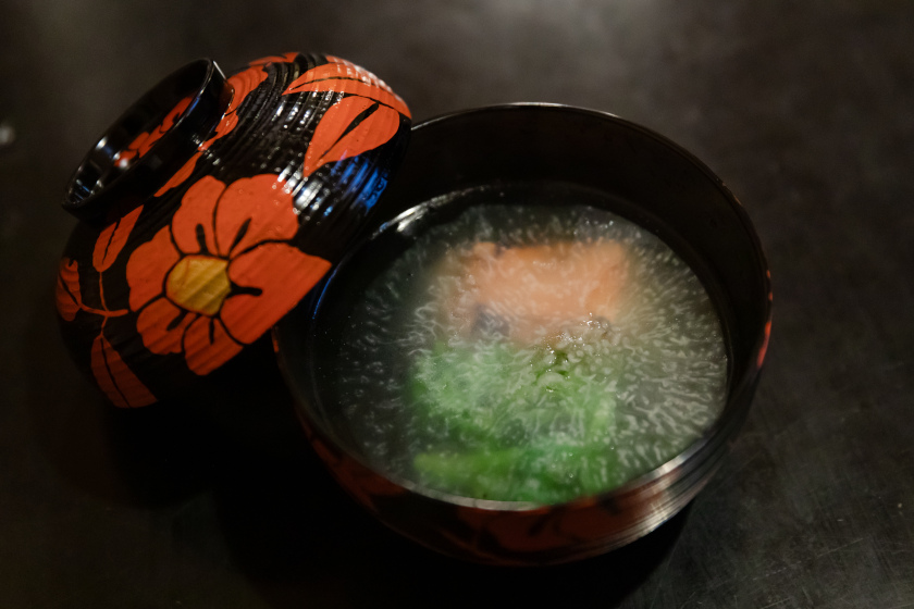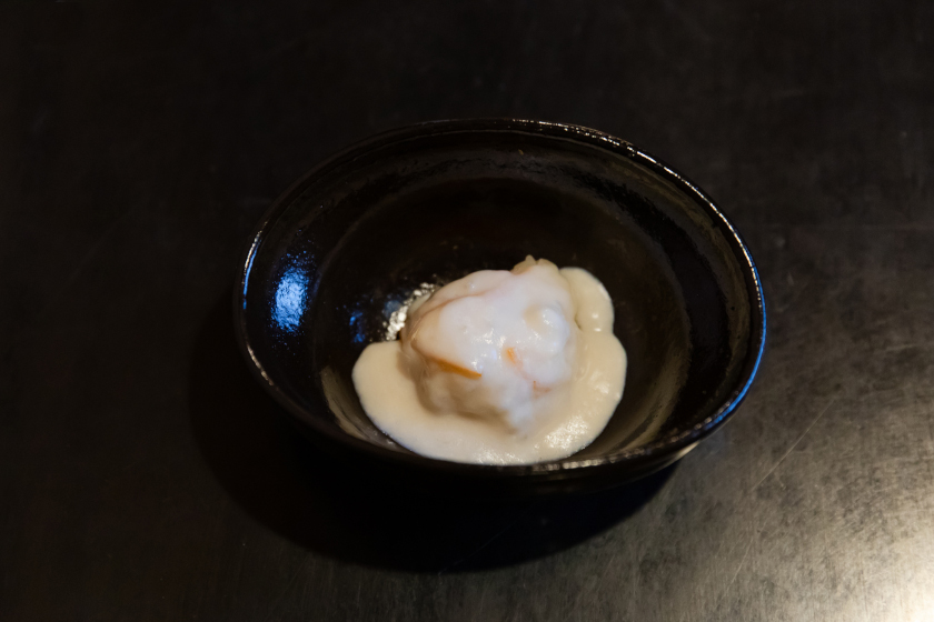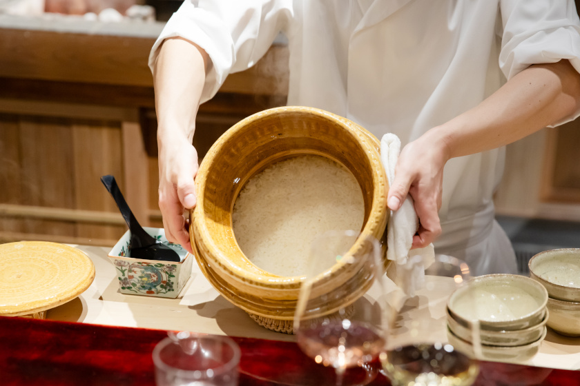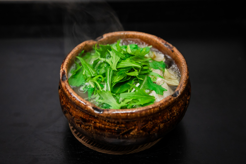 この日の料理は、冬から春へと移ろう季節を感じさせる献立。若狭ふぐの白子を使った飯蒸しから始まり、節分や初午の情景を表現した八寸、聖護院かぶらと金目鯛の椀物など、季節の節目を映した料理が続きました。