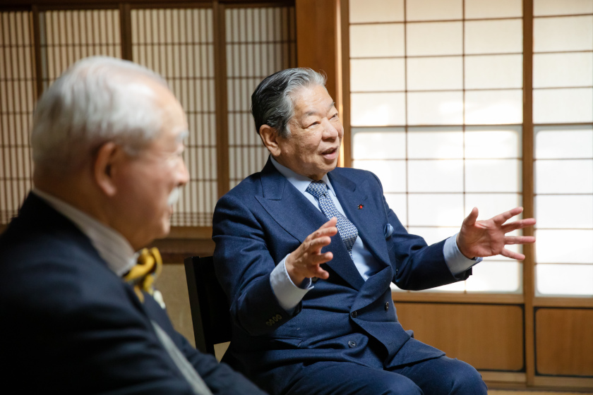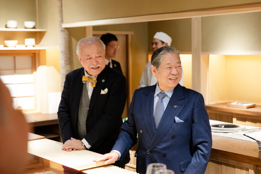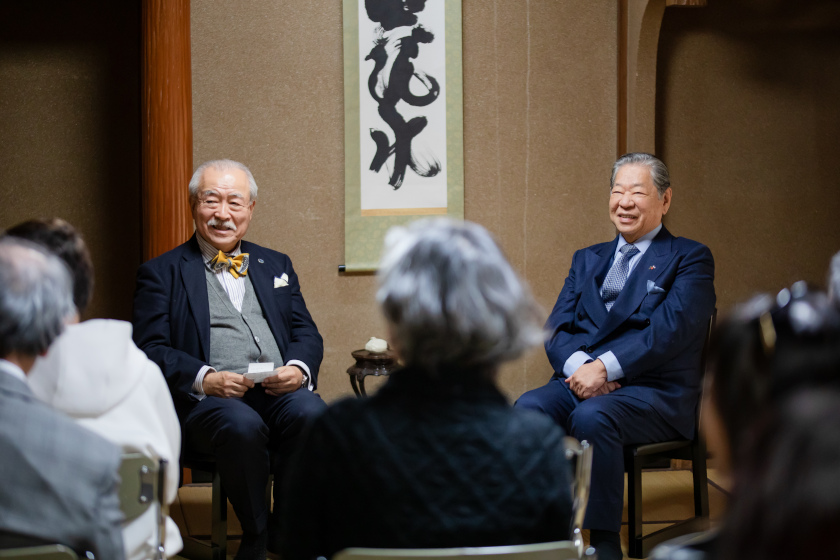 この日は食事に先立ち、京都の老舗料亭「菊乃井」三代目主人・村田吉弘さんと、越山若水のキュレーターで「あまから手帖」編集顧問の門上武司さんによるトークセッションが行われました。
