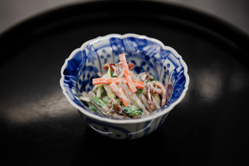 セリ、ウルイ、ゴボウ、人参、自家製の干し柿が入ったシンプルな白和えは、異なる仕立ての5種類の素材を一つにまとめたもの。菊乃井で学んだチームの大切さを福井でも体現していきたいという友本さんの初心に返った思いが込められていました。