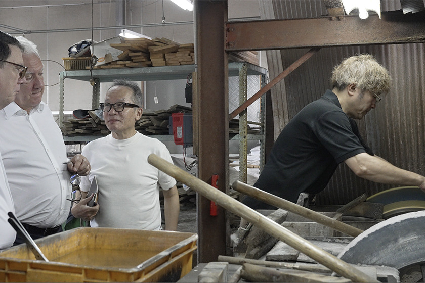 翌日訪れたのは、越前打刃物の「高村刃物製作所」。100を超える工程のうち、7回ほど砥石を替えながら丁寧に仕上げていく「研ぎ」の様子を、時間をかけてじっくりと視察。