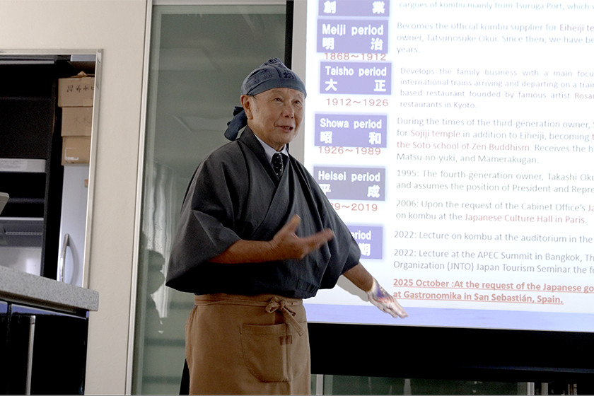 2025年8月29日~30日の2日間、デュカス氏はへしこや昆布、伝統野菜などの産地をめぐり、食と文化を体感。最終日となった8月31日は永平寺町の「ESHIKOTO」で特別イベント「福井教室」が開かれました。