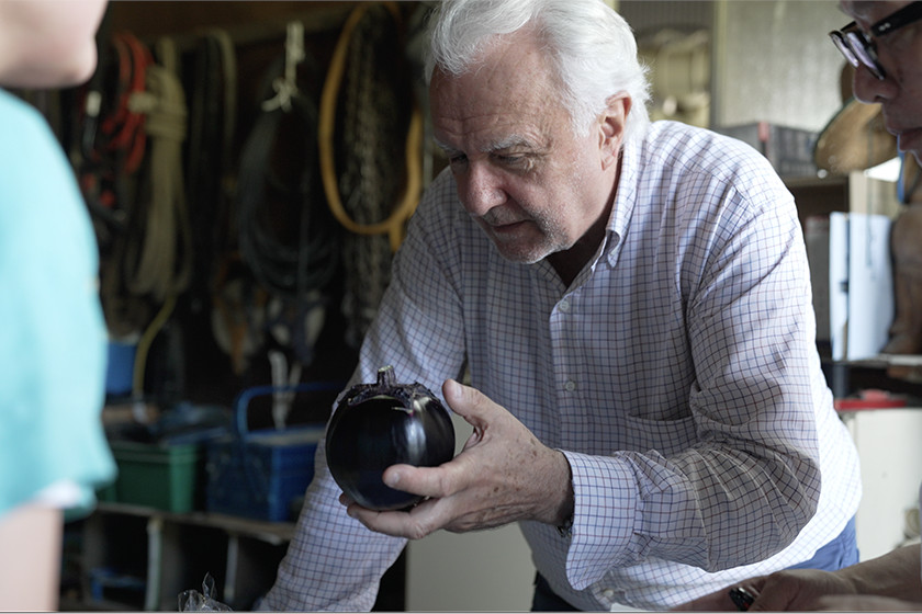 艶やかに育った吉川ナスを手に取り「まるで作り物のように美しい」と称賛するデュカス氏