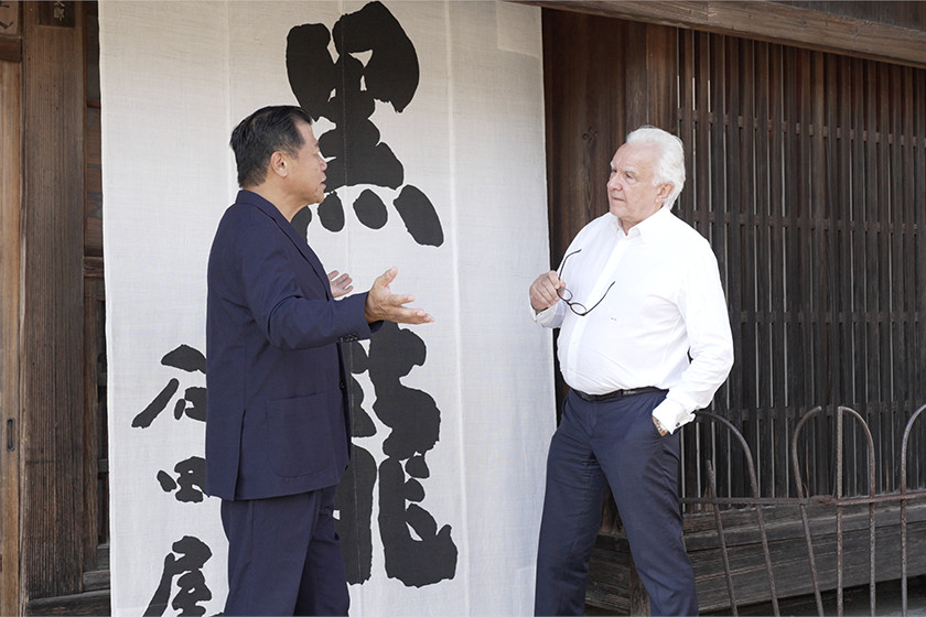200年以上にわたる黒龍酒造の歴史を説明する八代目蔵元の水野さん(左)