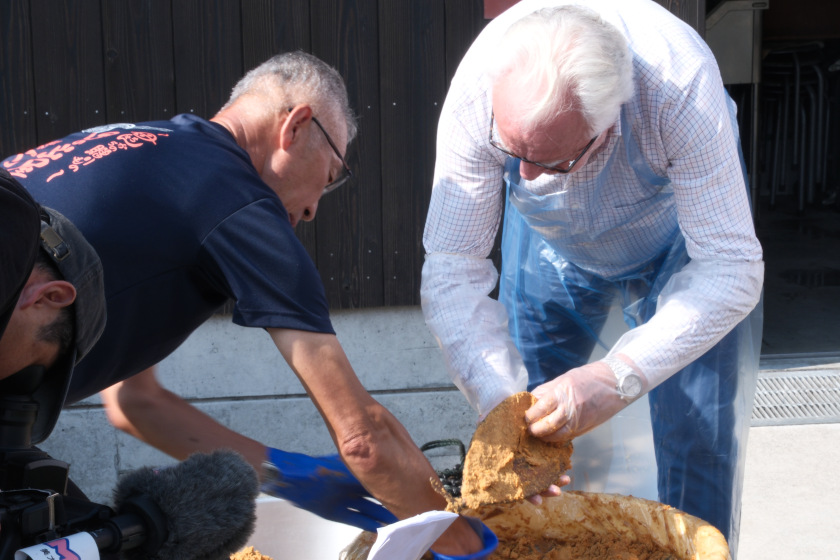 潮の香りが漂う蔵の中で、デュカス氏はぬか漬けの樽から鯖を取り出す“樽上げ”を体験しました。長い時間をかけて発酵するへしこの香りに、「日本の保存食文化の奥深さを感じる」と感嘆の声。