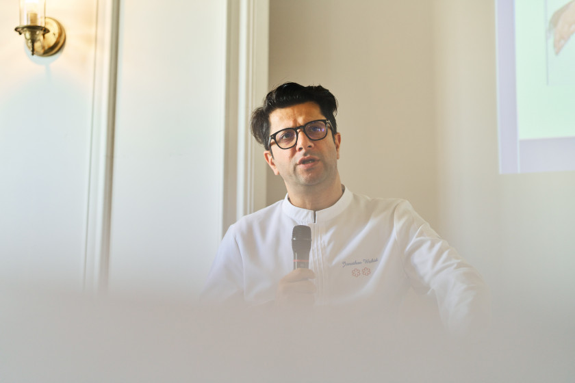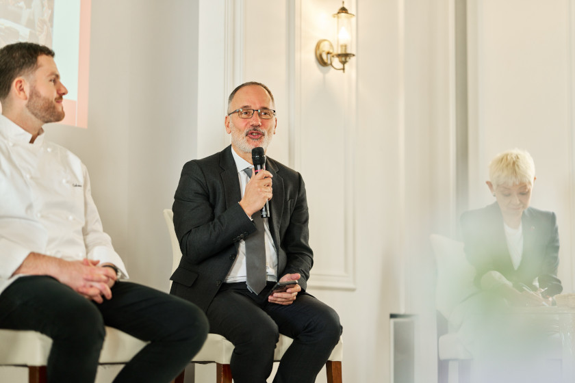 パリの本校のほかフランス各地にキャンパスを持ち、約2700人の学生を擁する料理学校「FERRANDI Paris」の校長を務めるトマ・アラニック氏。フランス料理の今後について「今後のフランスでは、何か一つの代表作を持つレストランが増えていくと考える」「顧客の情報管理や無駄のないストック運用など、データをしっかり取っていくことが重要」との考えを示しました。 さらに、フランス料理界を担う人材を育てる立場として、「学生たちにさまざまな道を示し、そのために必要な力を身につけさせることが学校の使命だと捉えている」と語りました。
