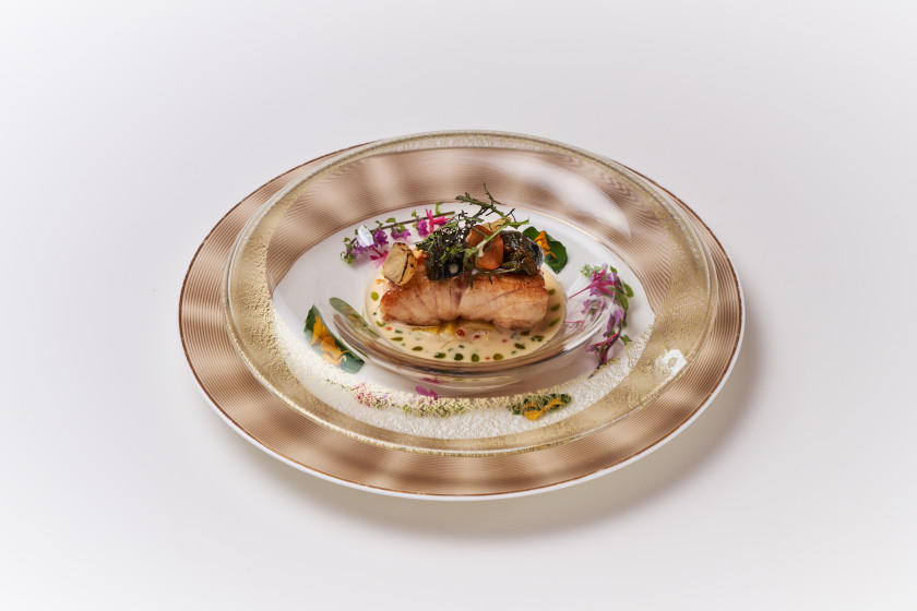 続いて魚料理を担当するのはパトリック・アンリルー氏です。福井の魚・マハタに、燻製したマスの卵のソースが合わせられています。 カリカリとした食感と滑らかでとろけるソースの食感のコントラストが楽しめる、エレガントな一皿です。