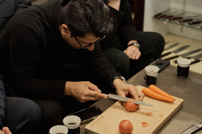 見学の後は試し切り。実際に包丁を手に取ったジョナサン・ワイド氏、カルビン・ルオー氏は、その切れ味に驚きを隠せない様子でした。