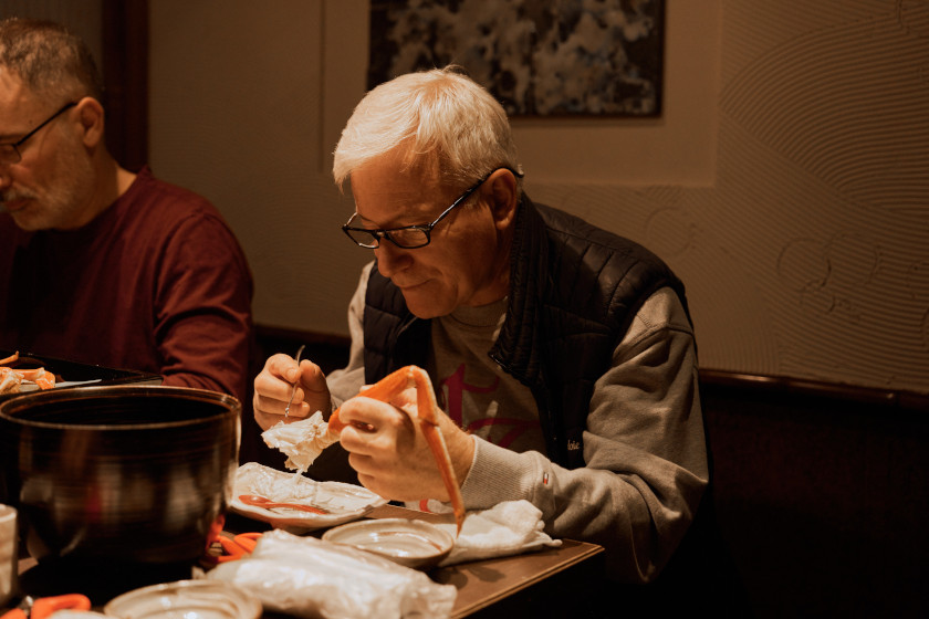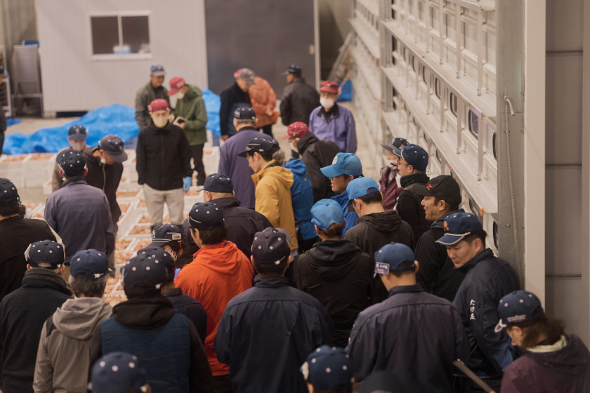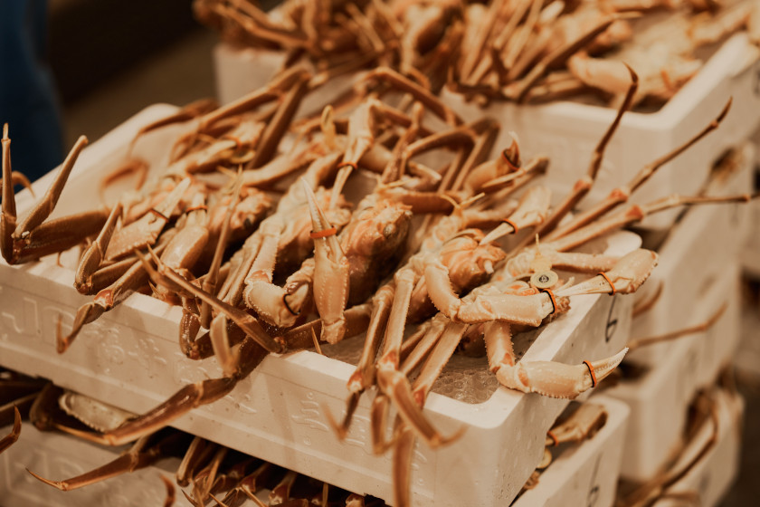 夕暮れ時には三国港へ。ちょうど始まった「越前がに」の夕競りを見学しました。通常、競りは早朝に行われますが、三国港では夕方に行われます。夜中出港した船は、翌日の夕方までに帰港し、すぐに市場で競りが行われてその日の夜に県内外の各地に発送されるため、新鮮なまま届けることができるそう。