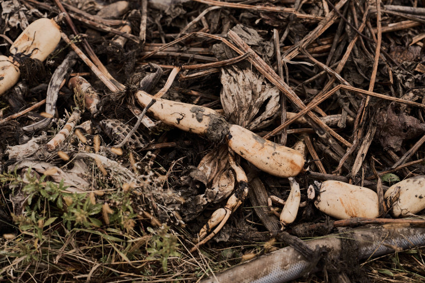 田んぼの中に入り、泥だらけになりながらレンコンを掘り出していきます