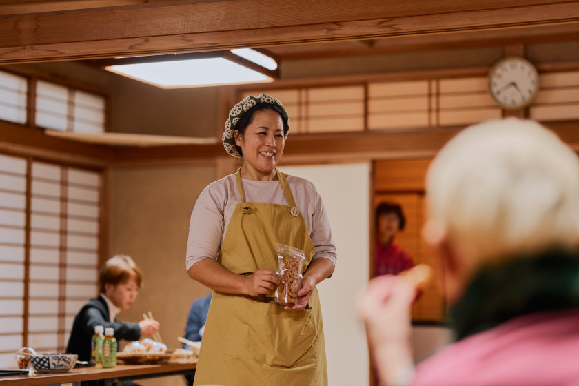 体験後には、修行僧がつくる精進料理「戒号膳(かいこうぜん)」をいただきました。ごま豆腐、煮物、蛇腹昆布など、野菜を余すことなく生かした十の献立。大本山永平寺の調理を取り仕切る典座・西村眞典さんからは「芯も皮も捨てず、別の一品へと生まれ変わらせる」という教えを伺いました。食前に唱える「五観の偈(ごかんのげ)」とともに、食材と命への敬意が息づく食文化に触れる時間となりました。
